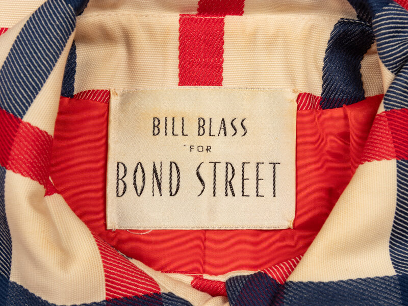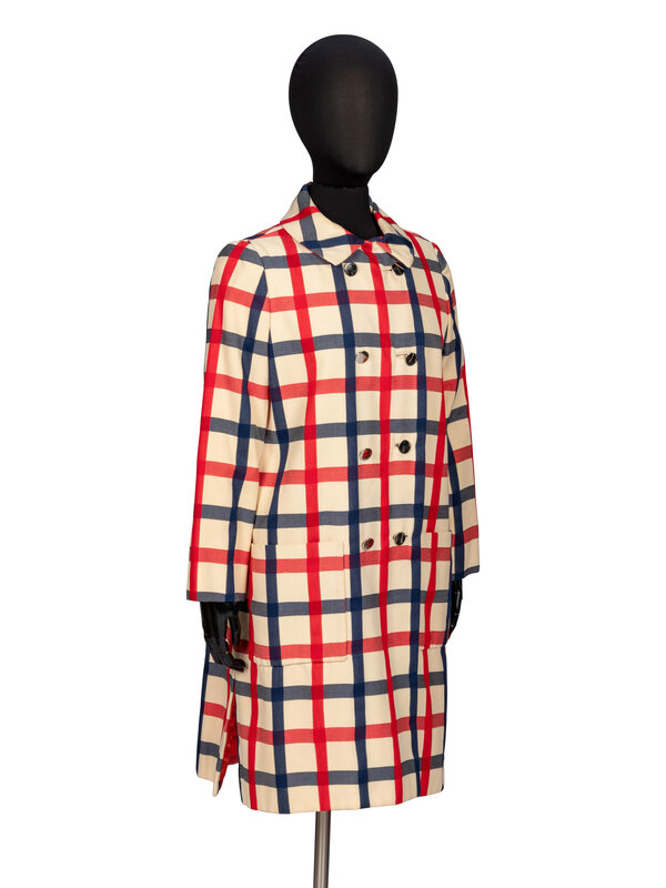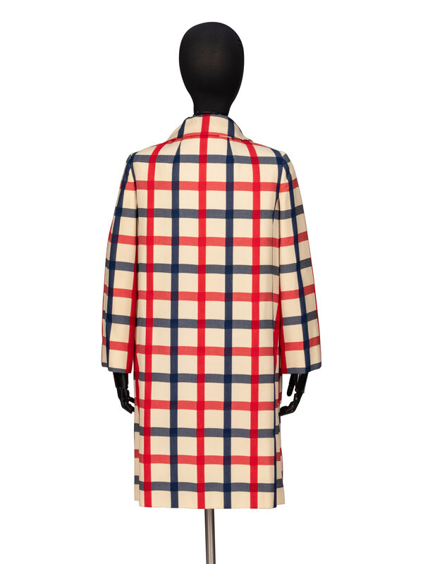 Knee-length coat in a cream, red, and blue windowpane check wool. Spread collar. Full-length set-in sleeves. Two patch pockets at front. Double breasted; four metallic button closures at front and two concealed snap closures at neckline. Fully lined.