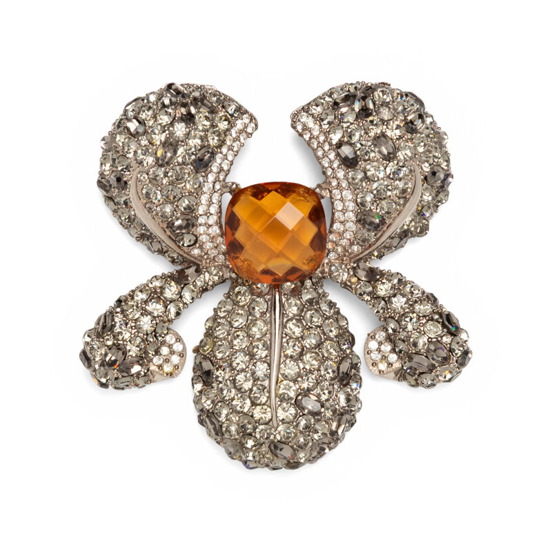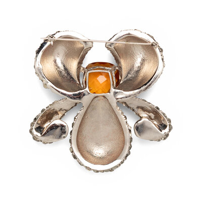 Orchid-shaped brooch in silver-tone metal with pavé-set rhinestones and a central amber-colored glass stone. Standard pin backing. Includes box.