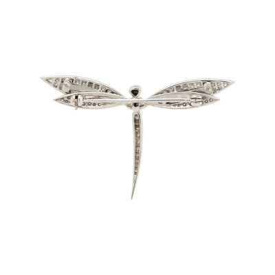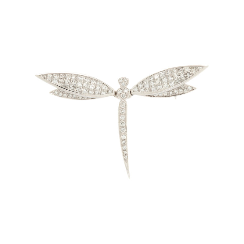 In a dragonfly design, the 'en tremblant' wings invisibly set with calibré cut diamonds and the body with pavé-set round diamonds, the diamonds weighing approximately 1.15 carats total. Mounted in 18 karat white gold. 2 x 1 3/8 inches.