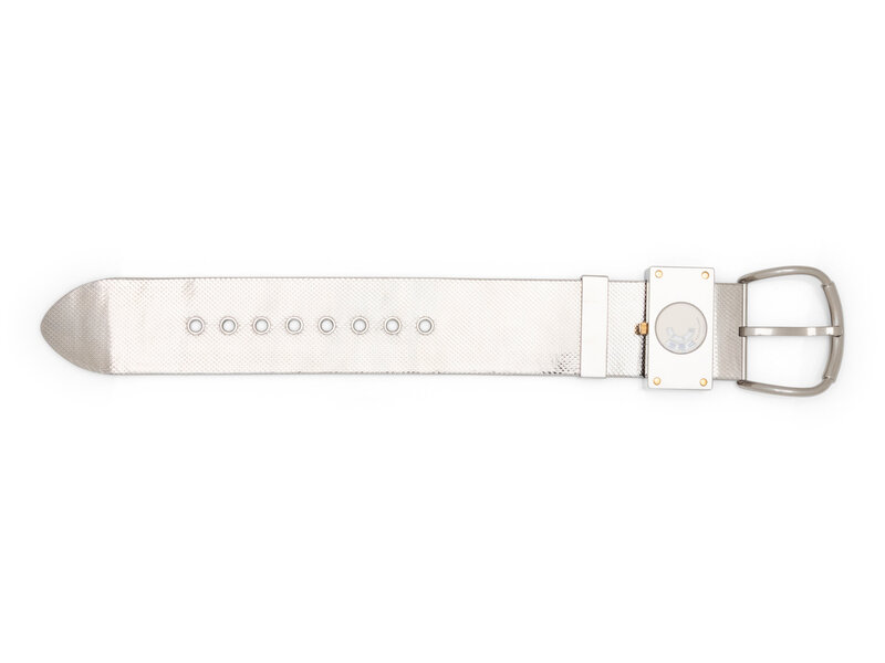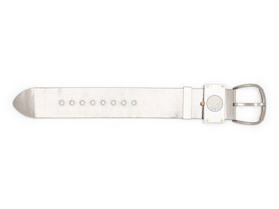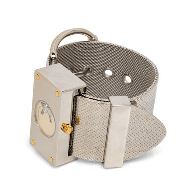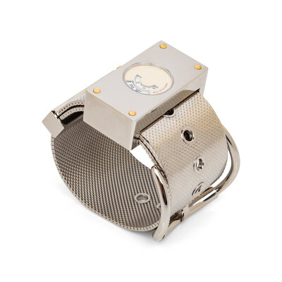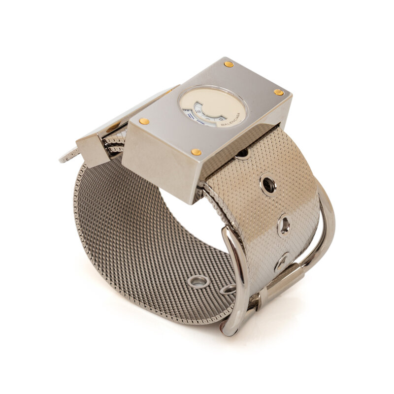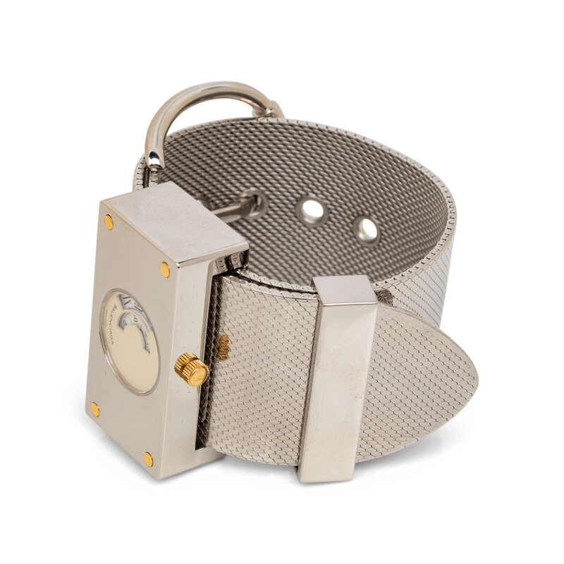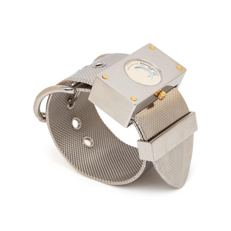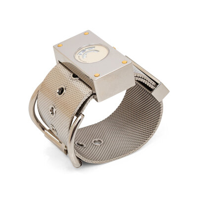 Montre Acier quartz watch in stainless steel and gold-tone metal. With smooth bezel, white flat dial, black Roman numeral hour markers, calendar aperture, fluted push/pull crown, stainless steel bracelet and tang buckle closure. Stamped 1174/1226 ; SWISS MADE ; WATER RESITANT at back of case.