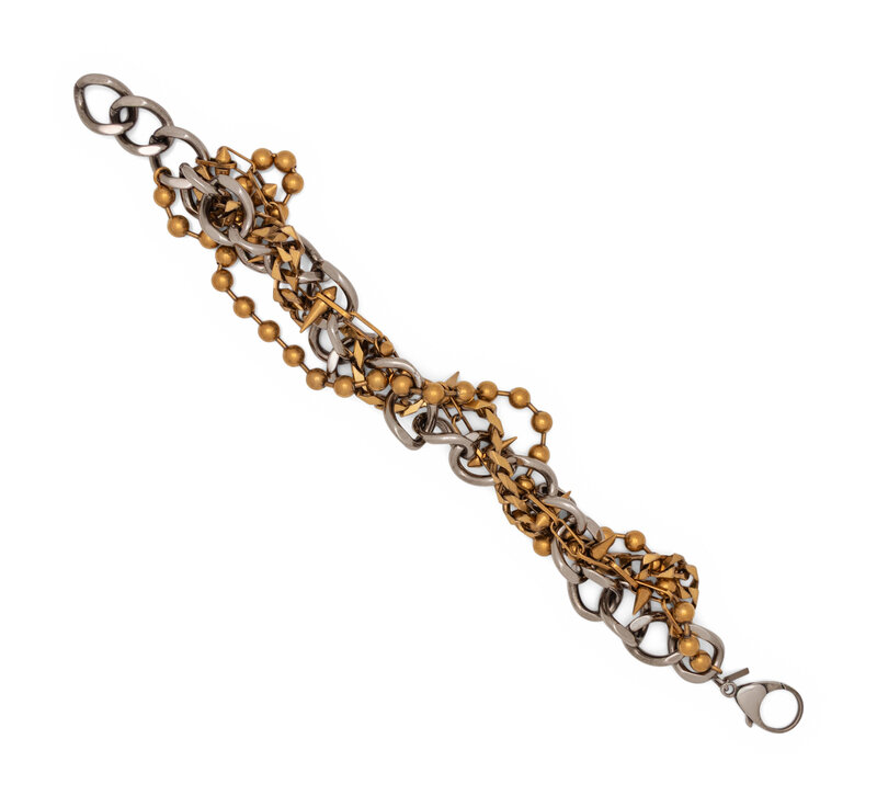 Layered multi-chain necklace in silver-tone metal & brass. Lobster claw clasp. Includes box.