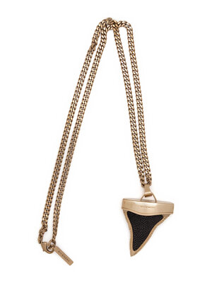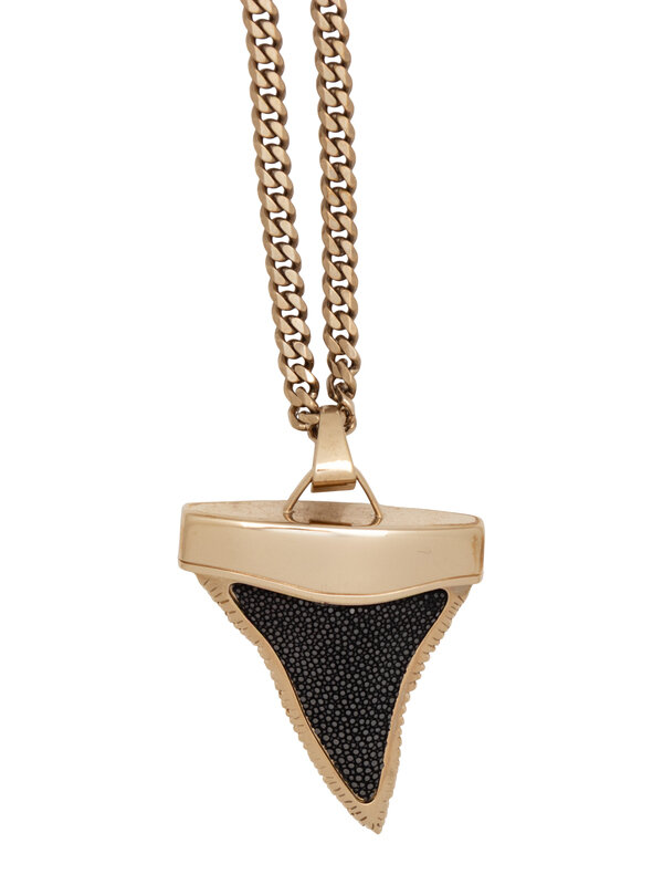 Shark tooth pendant necklace in gold-tone metal with faux-shagreen inset. Chain necklace with lobster claw clasp. Includes dust bag.
