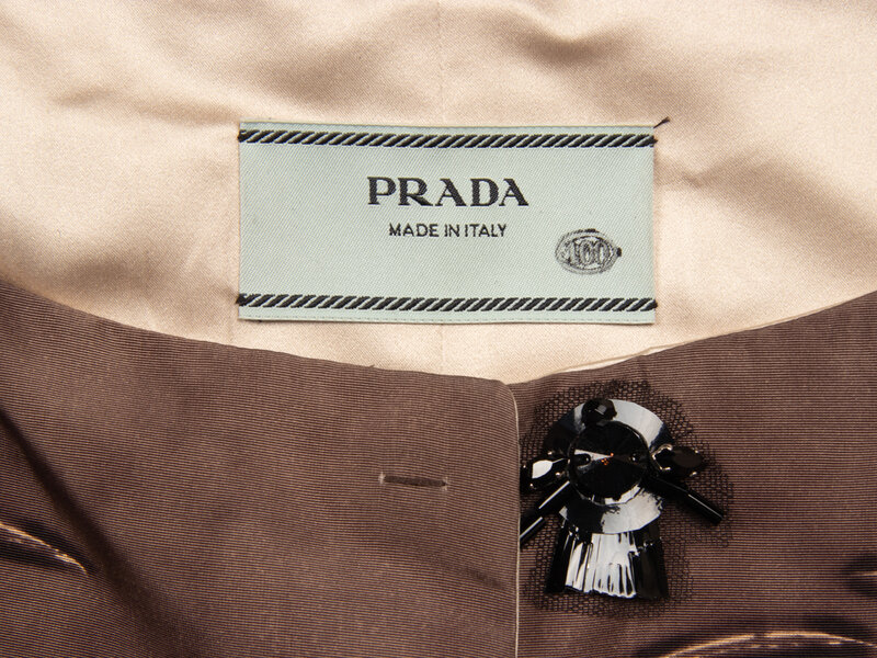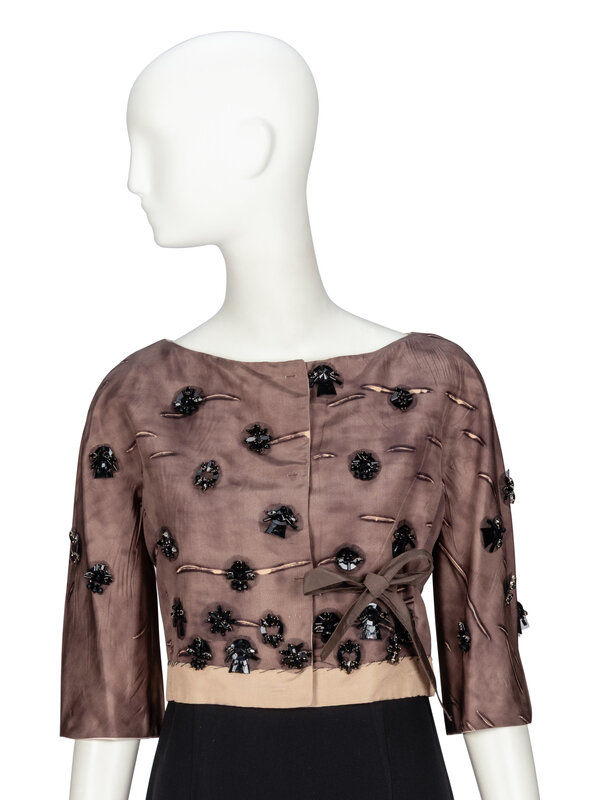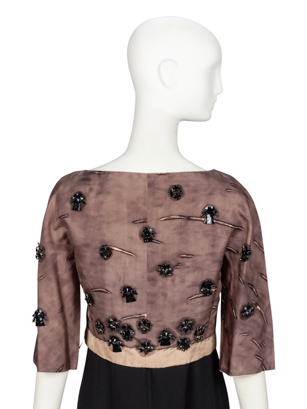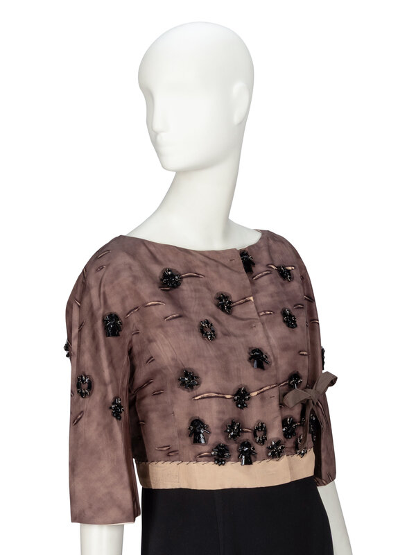 Cropped evening jacket in printed taupe silk faille with all-over jet bead & tulle embellishments. Wide bateau neckline. Elbow-length incorporated sleeves. Fabric-covered snap closures at front; self fabric ties at front. Fully lined in cream silk charmeuse.
