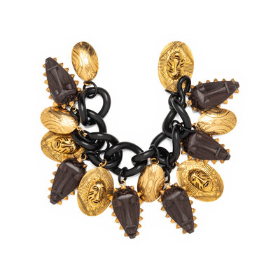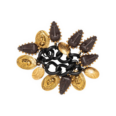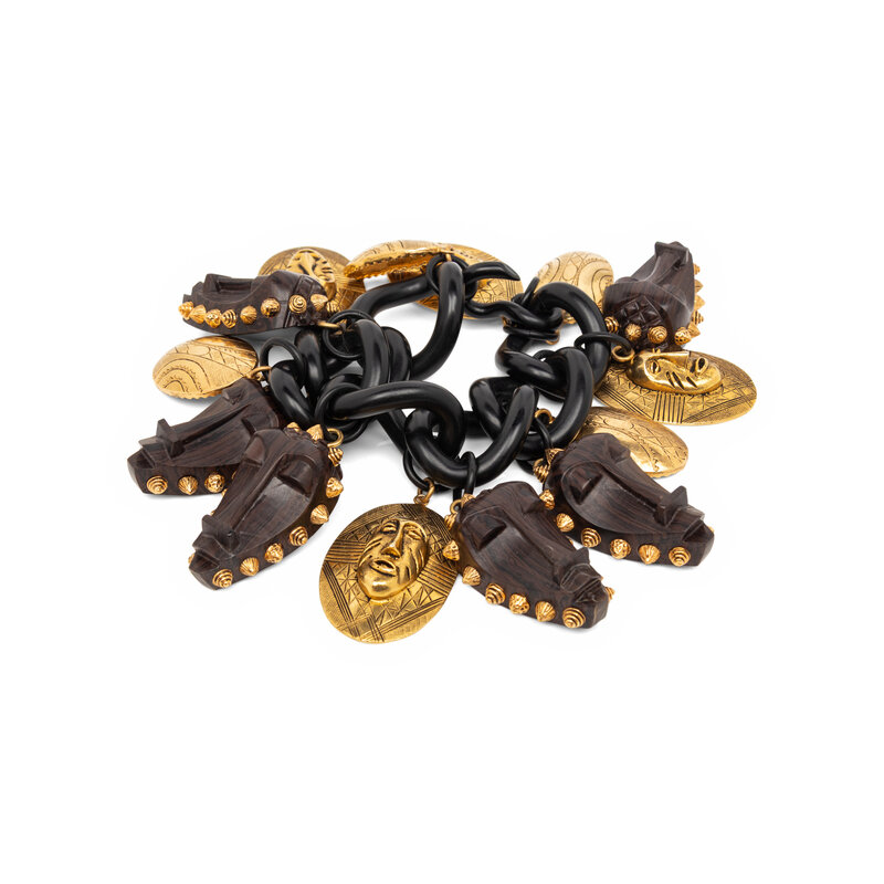 Chain bracelet with African mask and shield charms in gold-tone metal, wood, and composite. Includes box.