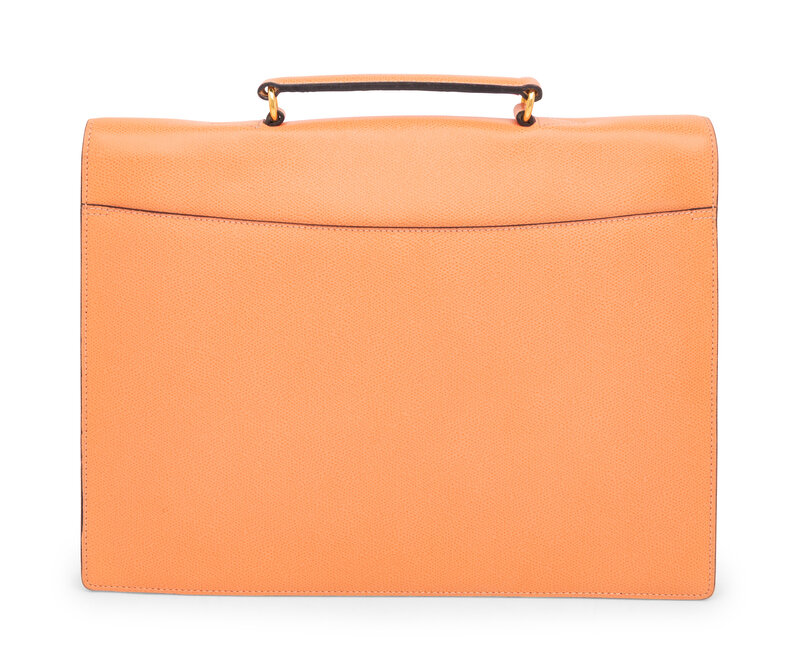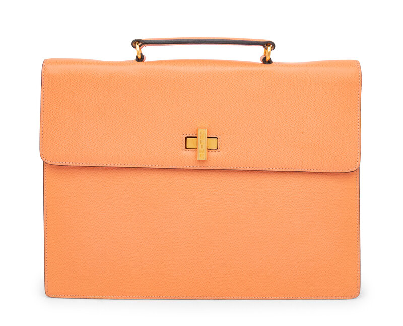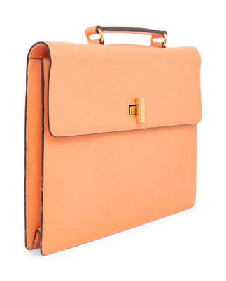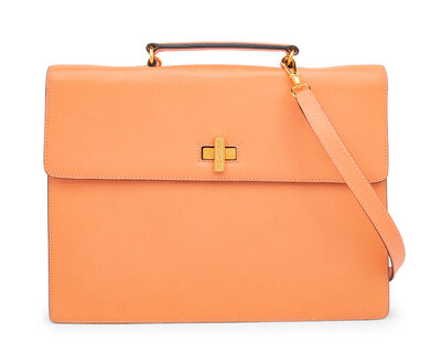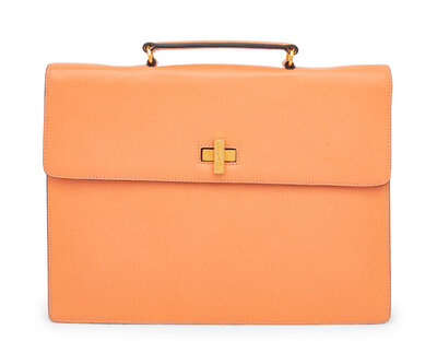 Briefcase in salmon-pink grained leather with gold-tone hardware. Turn-lock closure; leather handle and removable leather strap.