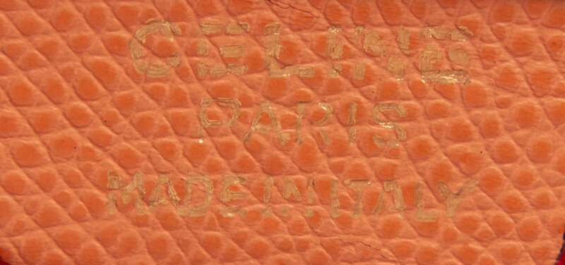 Details: Gold-tone hardware, turn-lock closure, exterior slip pocket at back, red leather lining, two interior slip pockets, one interior zipper pocket
