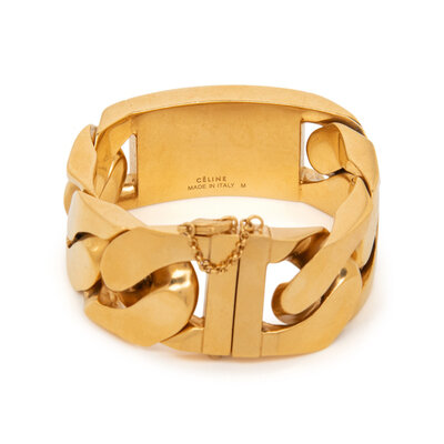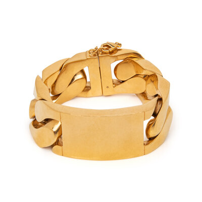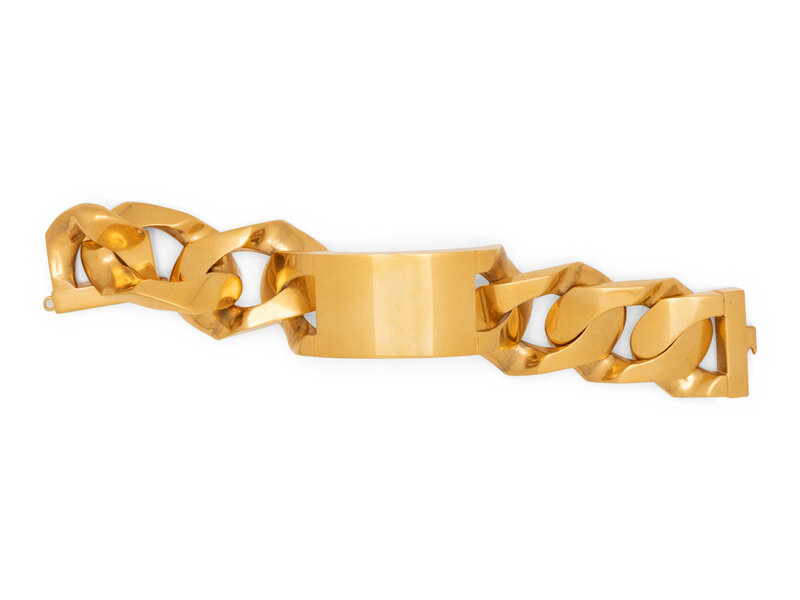 Oversize ID chain bracelet in gold-tone metal. Push-lock clasp with lobster claw clasp & chain connector.