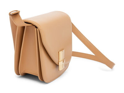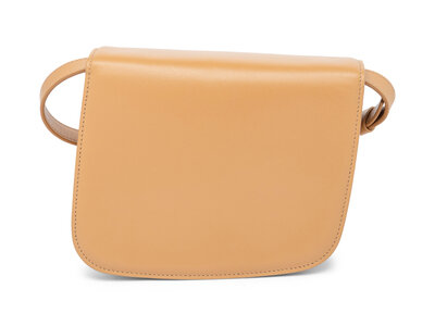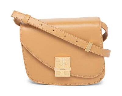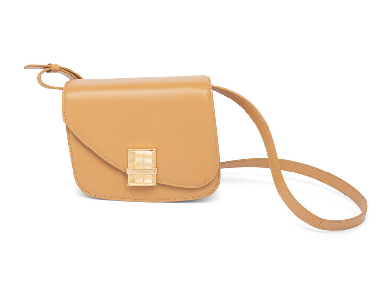 Fiamma small shoulder flap bag in camel-colored leather with gold-tone hardware. Magnetic snap closure and leather shoulder strap.