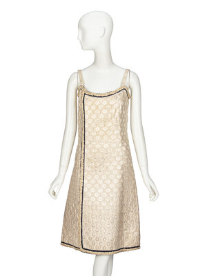 Faux-wrap dress in a gold & cream CC-logo brocade with navy petersham & self-braid trim throughout. Sleeveless; with self-fabric straps. Shaped neckline. Displaced zipper closure at side back bodice. Fully lined.