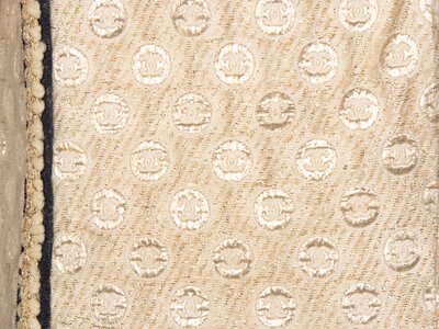 Fitted jacket in a gold & cream CC-logo brocade with navy petersham & self-braid trim throughout. Stand collar with turn-back lapels. Three-quarter-length three-piece sleeves with working vents/button closures at cuffs. Buttonhole closure at front. Metal chain weight at interior hem. Fully lined.