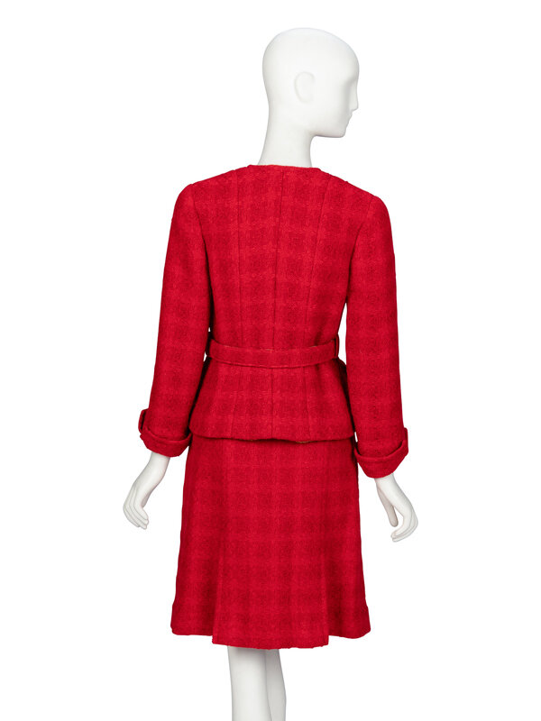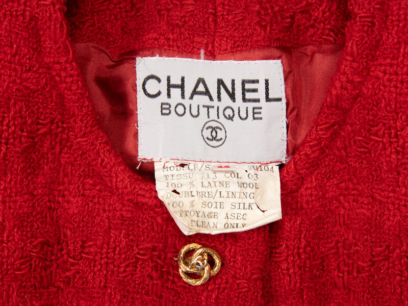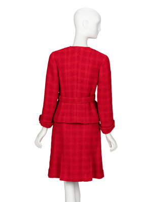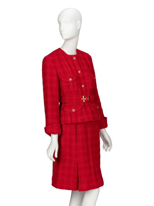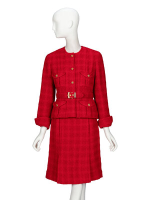 Cardigan jacket in lipstick red wool bouclé tweed. Collarless round neckline. Light padding at shoulders. Wrist-length sleeves with stitched turned-up cuffs. Four patch pockets at front with buttoned decorative flaps. Button closures at front with gold-tone metal filigree buttons. Gold-tone metal chain weight at hem interior. Fully lined in red silk habotai with quilting to tweed shell throughout. With removable tweed & leather belt.