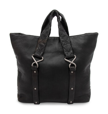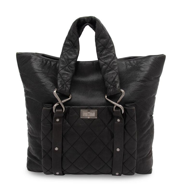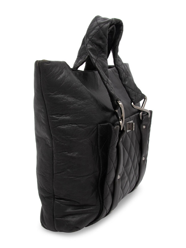 "8 Knots" tote bag in quilted black aged lambskin leather with silver-tone hardware. Magnetic snap closure and quilted leather straps.