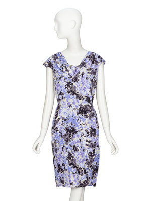 Knee-length dress in a multicolor watercolor floral-print silk faille. V-shaped collarless neckline with draped details. Cap sleeves. Fitted at waist; knee-length straight skirt. Invisible zipper closure at back. Fully lined.