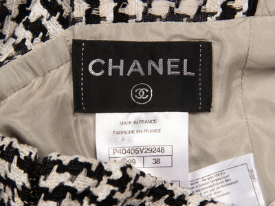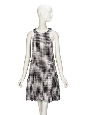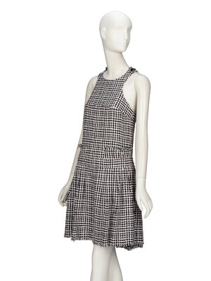 Sleeveless A-line dress in black & white multi-fiber blend houndstooth tweed. Crossed racerback style bodice with buttoned straps. Drop waist. Knee-length pleated skirt. Invisible zipper closure at back. Fully lined.
