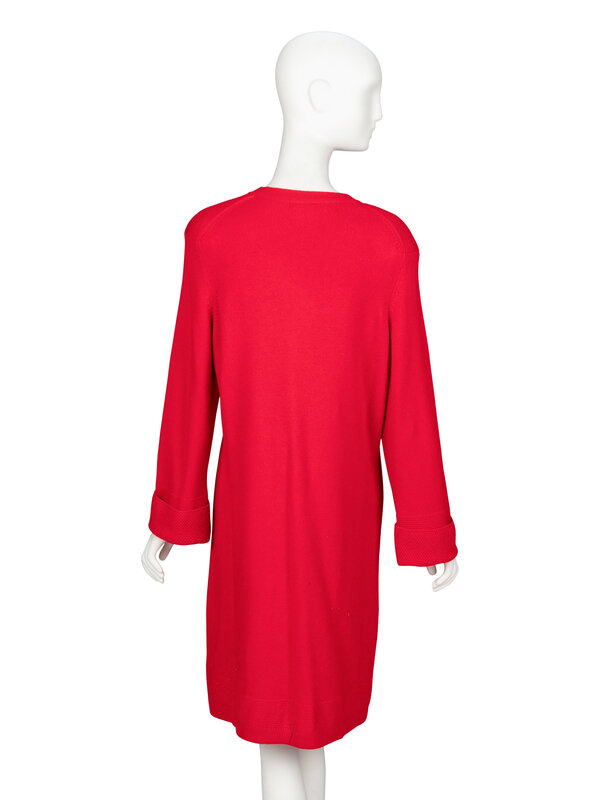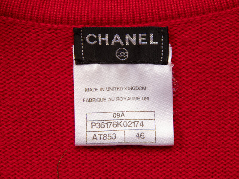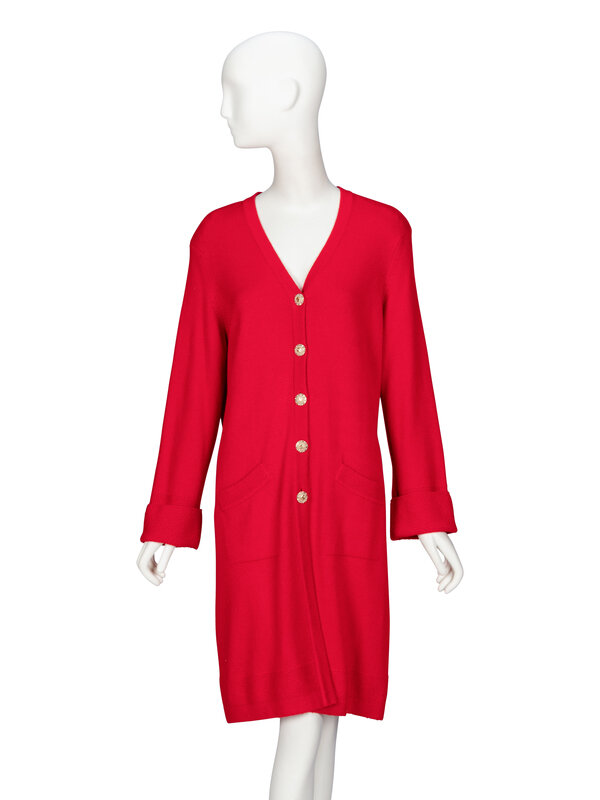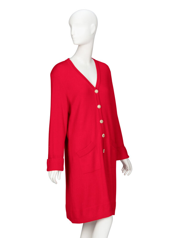 Knee-length duster cardigan in scarlet red cashmere knit. V neckline. Light padding at shoulders. Full-length sleeves with optional turn-up cuffs. Two patch pockets at front. Five button closures at front; with rhinestone & bead-embellished gold-tone metal buttons. Unlined.