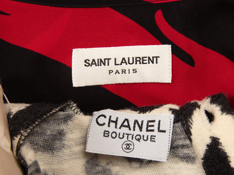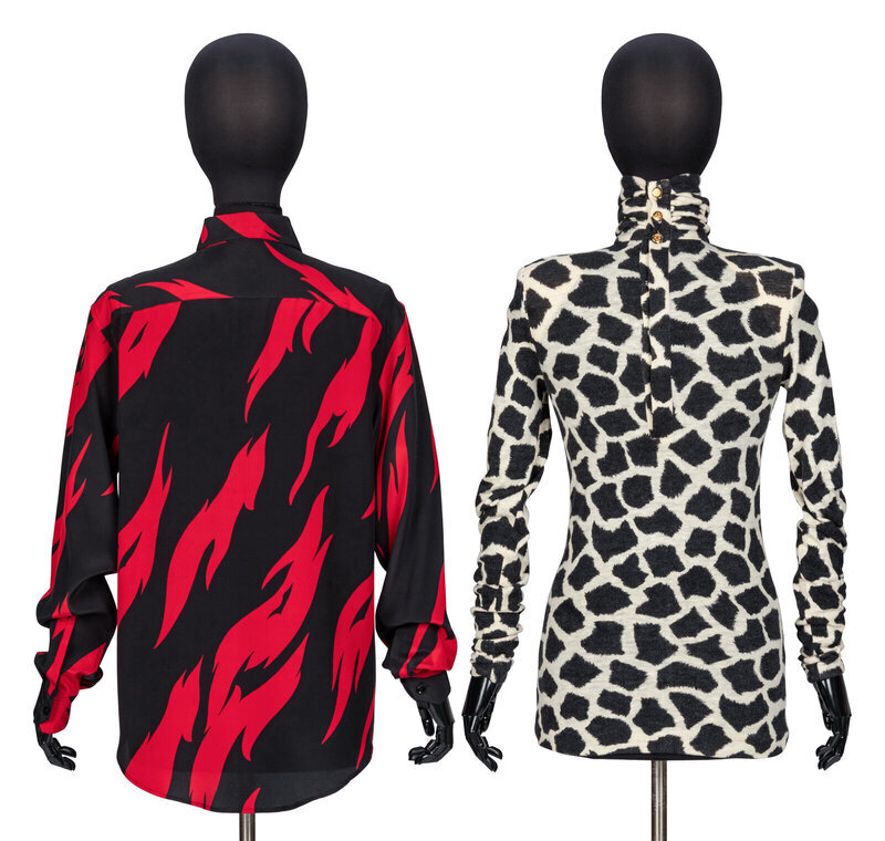 Long sleeve top in black & white animal-print wool jersey. High turtleneck collar. Padding at shoulders. Full-length sleeves with button closures at sleeve hems. Four buttoned patch pockets at front. Button and snap closures at back neck. Unlined.