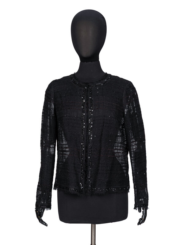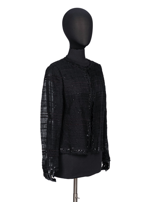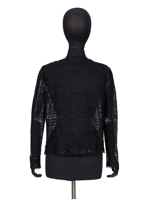 Lightweight cardigan jacket in sheer black chiffon jacquard with a plaid-like woven pattern throughout. Embellished & frayed-edge trim throughout edges. Round, collarless neckline. Full-length set-in sleeves. Single hook-and-eye closure at neckline. Unlined.