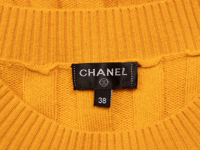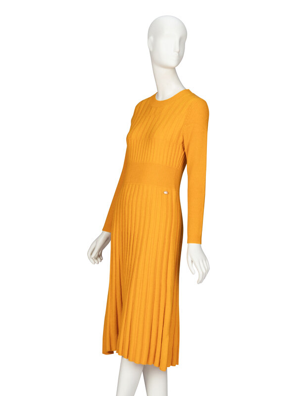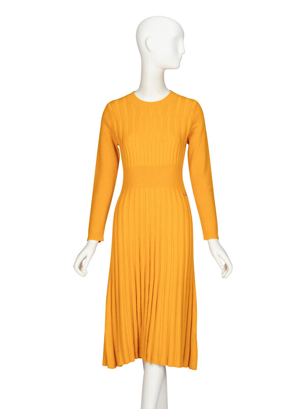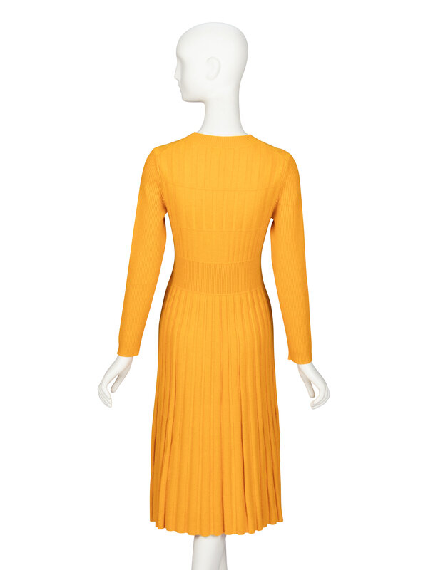 Long-sleeved sweater dress in saffron yellow wool/cashmere-blend ribbed knit; moderate stretch content. Flat round collar. Full-length fitted sleeves. Slightly waisted silhouette. Midi-length flared skirt. Unlined.