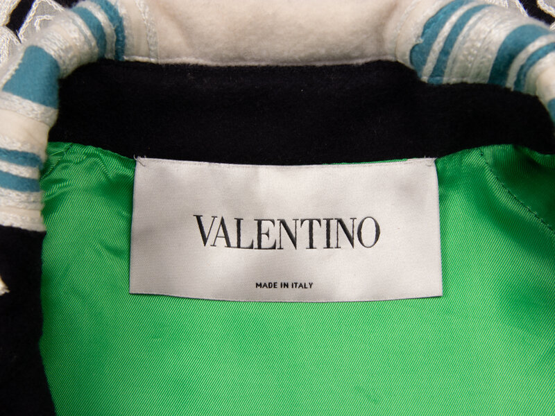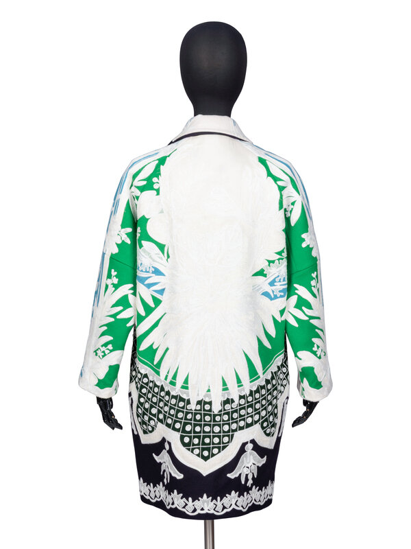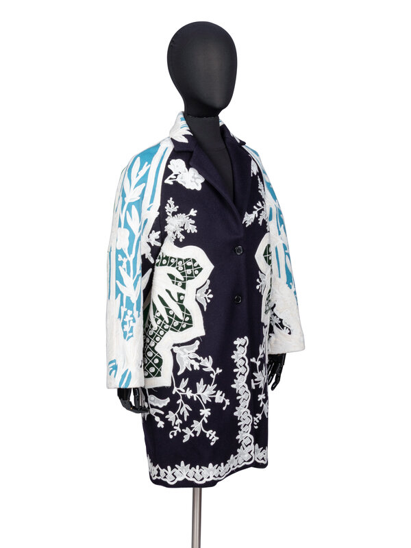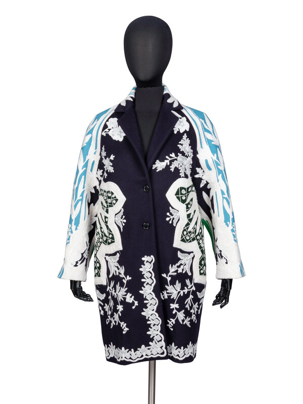 Top coat in multicolored felted wool/cashmere-blend coating with all-over white floral embroidery with insets. Notched lapels. Full-length raglan sleeves. Single breasted; two button closures at front. Fully lined.