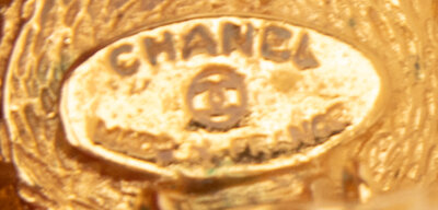 Ear clips in gold-tone metal with a simulated pearl bead; features metal "CHANEL" logo around perimeters. Standard ear clip backs.