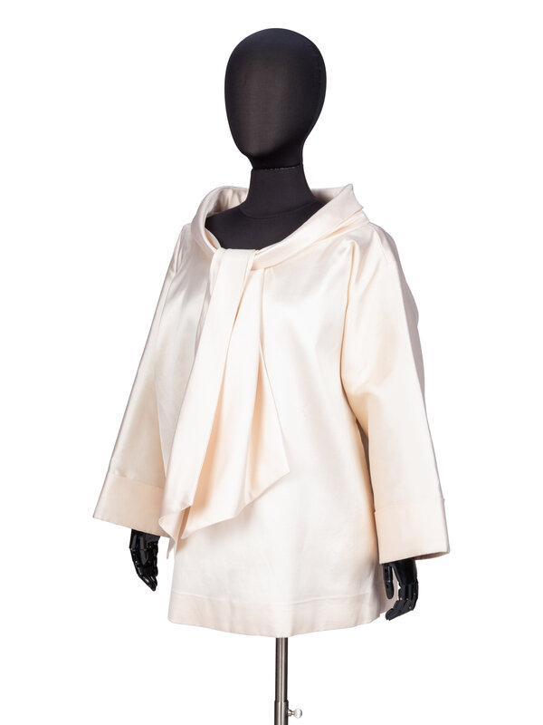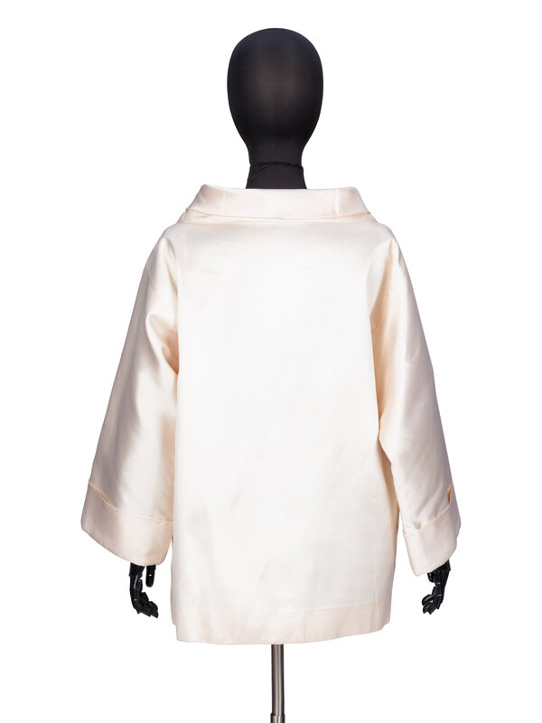 Boxy tunic/blouse in cream silk twill. Wide neckline & stand collar with extended ties at front. Full-length kimono-style incorporated sleeves with optional cuffs at sleeve hems. In-seam slit pockets at sides. Fully lined in silk organza.