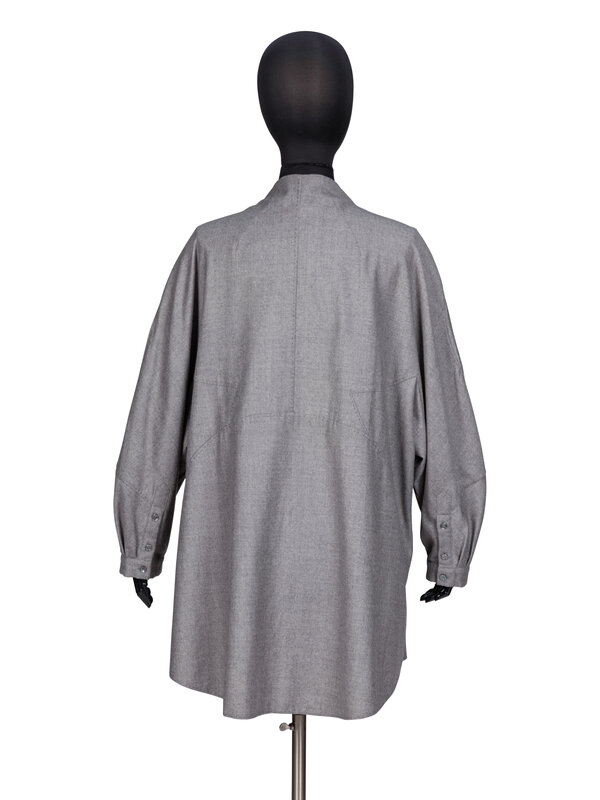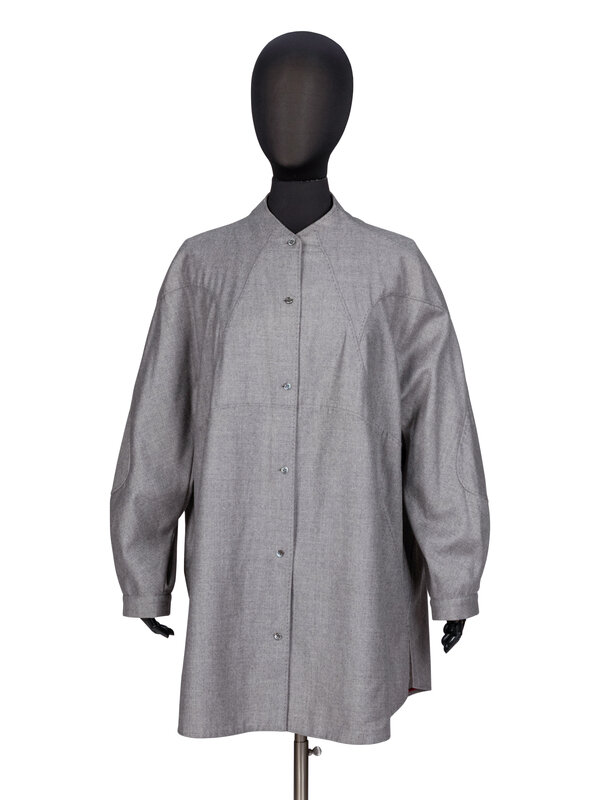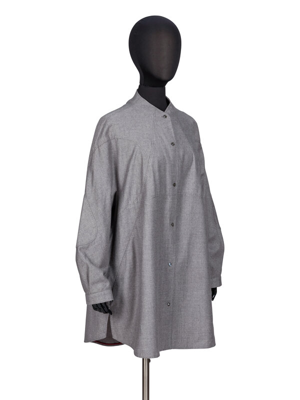 Overshirt in grey cashmere flannel. Decorative piecing and topstitching throughout. Grown-on stand collar. Full-length sleeves with buttoned shirt cuffs. Button closures at front. Fully lined.