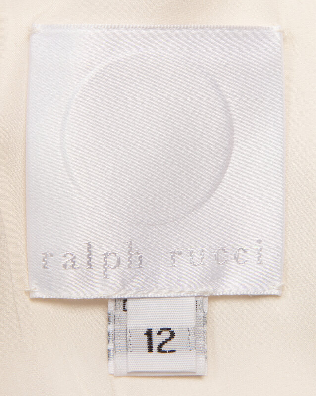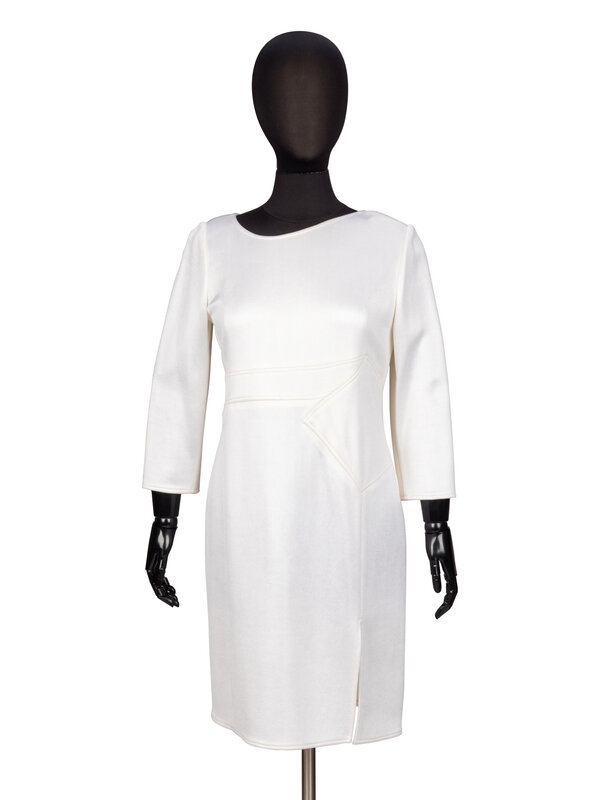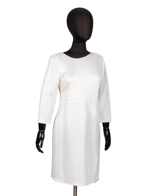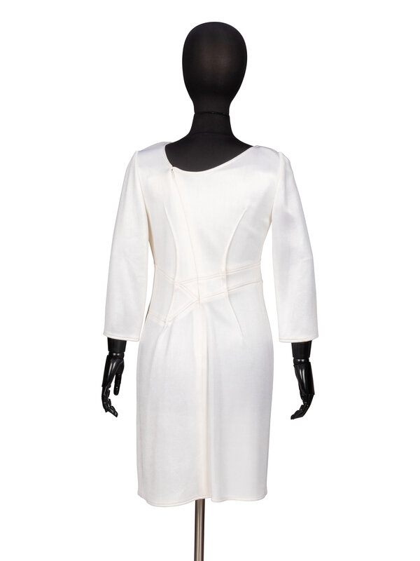 Knee-length dress in a shimmery ivory stretch-blend viscose knit. Wide collarless asymmetric neckline. Three-quarter-length set-in sleeves. Decorative paneling at waist. Knee-length straight skirt with short slit at front. Invisible zipper closure at back. Partially lined.