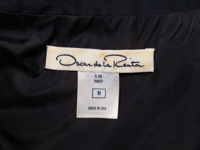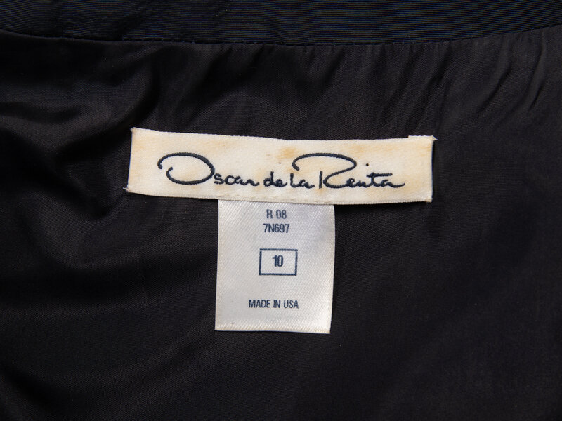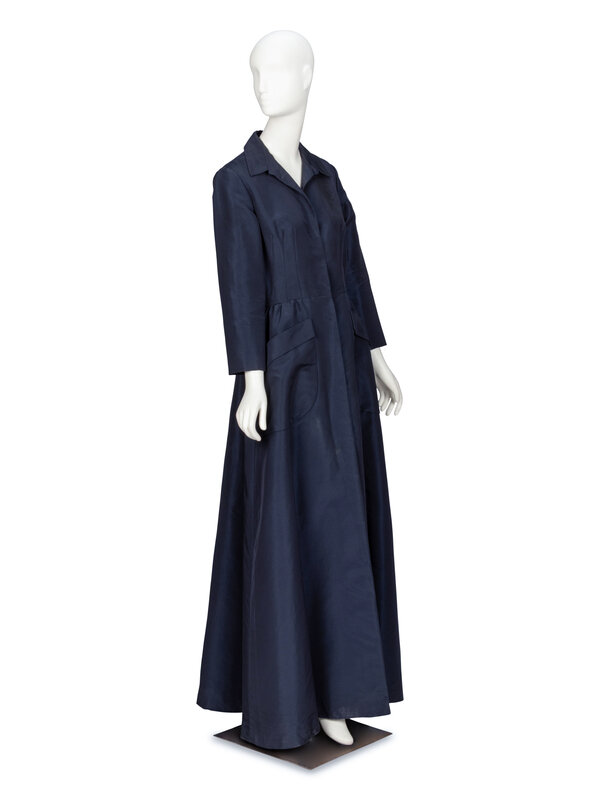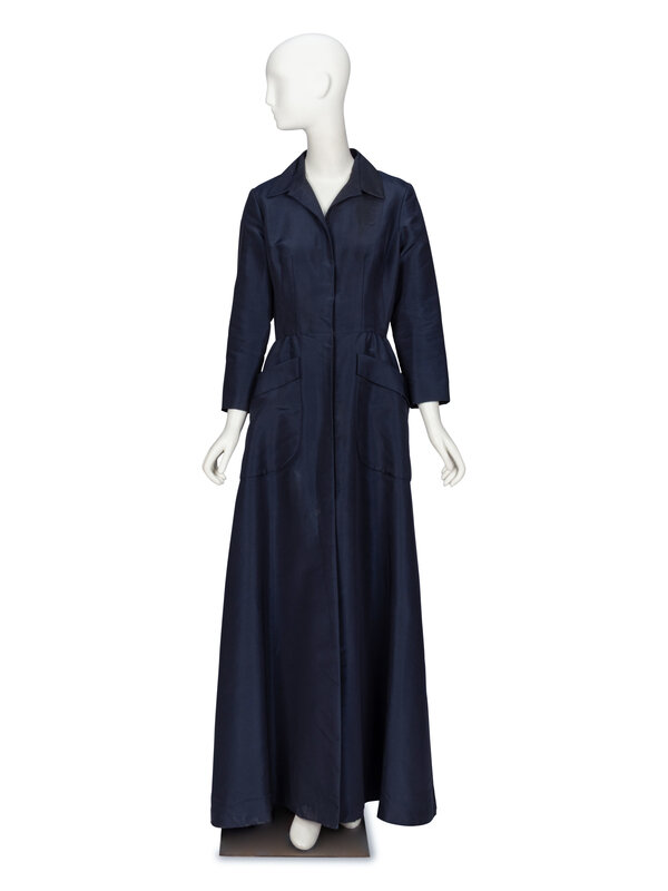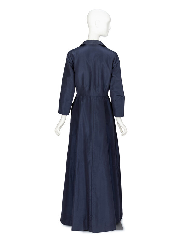 Full-length shirtdress-style gown in navy silk faille. Spread collar. Wrist-length set-in sleeves. Fitted bodice & waist. Full-length A-line skirt with two patch pockets at hips. Concealed zipper and snap closures at front. Fully lined.