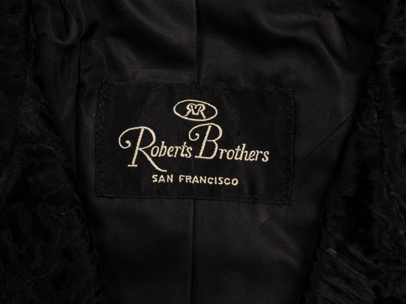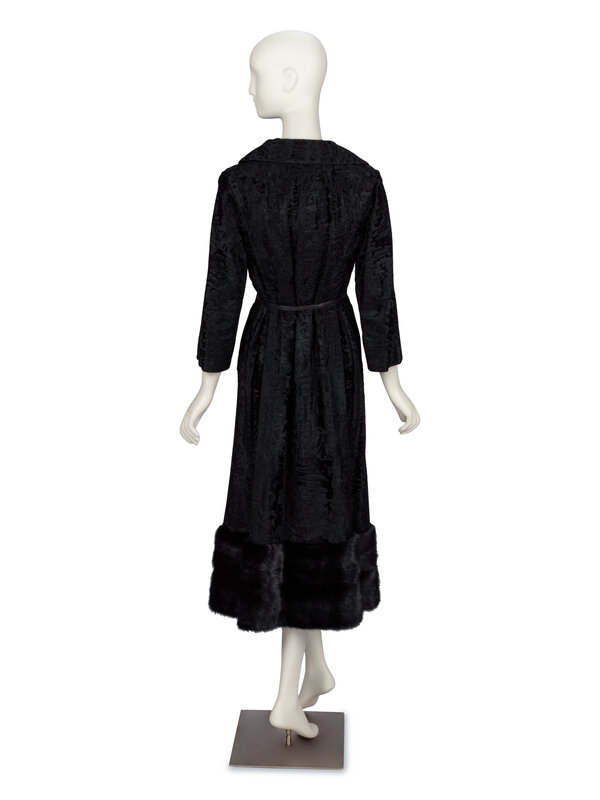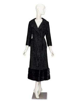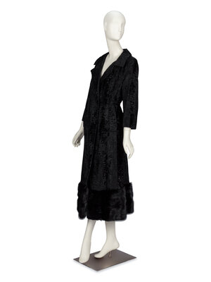 Seven-eighths length coat in black broadtail fur with a wide band of black mink fur trim at hem. Open-front with two belt holes; with removable black leather belt closure. Spread collar with notched lapels. Three-quarter-length sleeves. Two welt pockets at front; one interior welt pocket. Fully lined. Small monogram embroidery at interior.