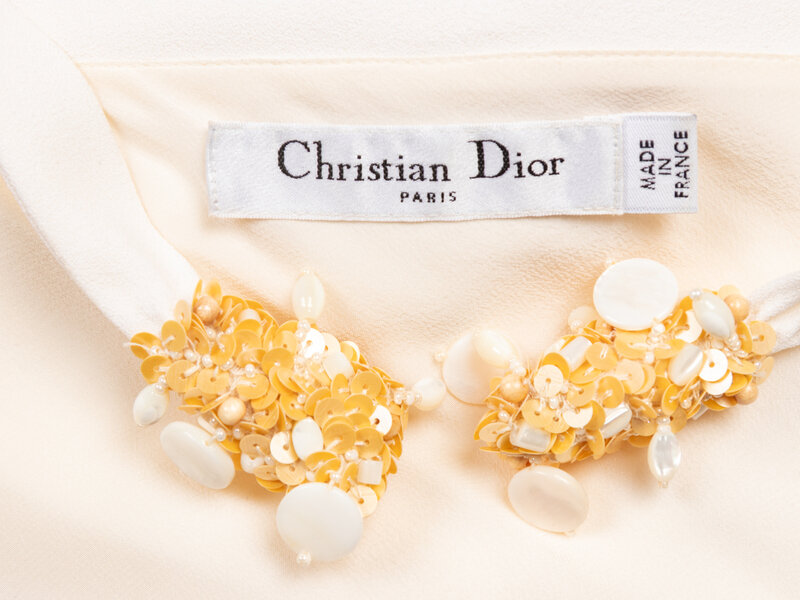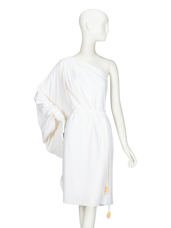One-sleeve cocktail dress in cream acetate/viscose-blend crêpe. Asymmetric diagonal neckline with pleats radiating from shoulder. Single full-length dolman sleeve with a double buttoned shirt cuff. Knee-length skirt. Features self-fabric adjustable belt at waist with long ties & sequin-embellished ends. Invisible zipper closure at side bodice. Fully lined.