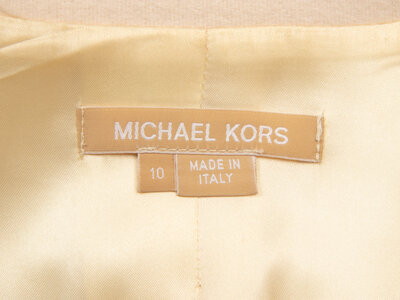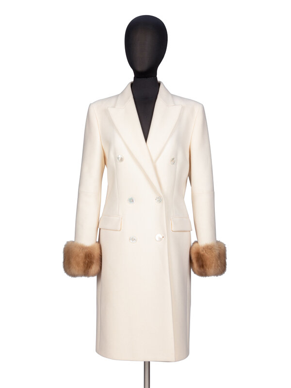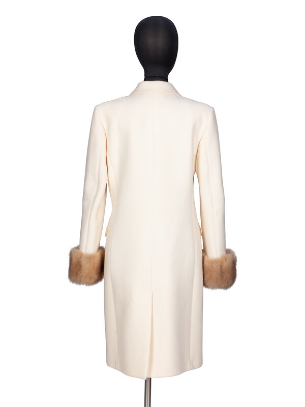 Knee-length coat in cream virgin wool coating. Notched & peaked lapels. Light padding at shoulders. Full-length set-in sleeves with sable fur trim at cuffs. Two besom pockets with flaps at front. Double breasted; two button closures at front with mother-of-pearl buttons. Fully lined.