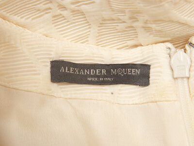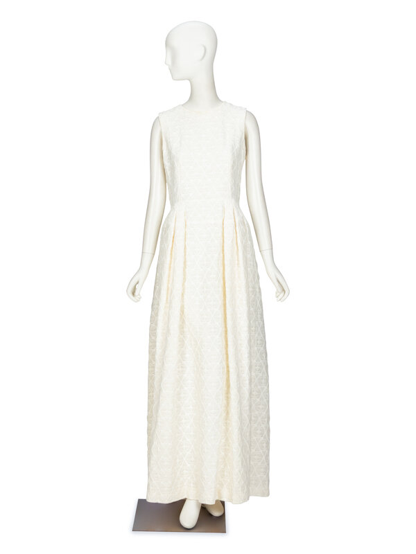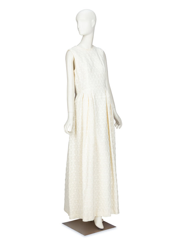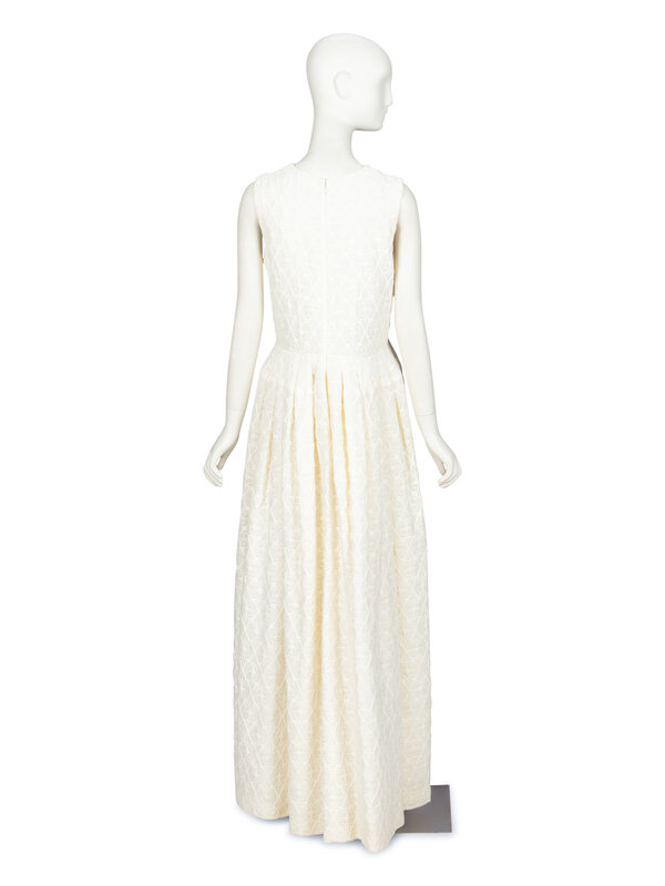 Sleeveless gown in ivory matelassé/jacquard textile. Round collarless neckline. Fitted bodice. Full-length skirt with pleats at side waist & at back waist. Invisible zipper closure at back. Fully lined.