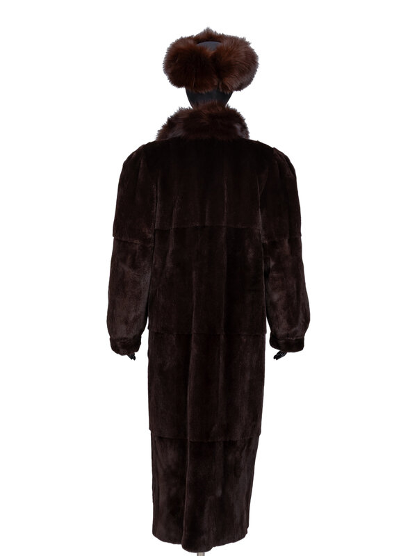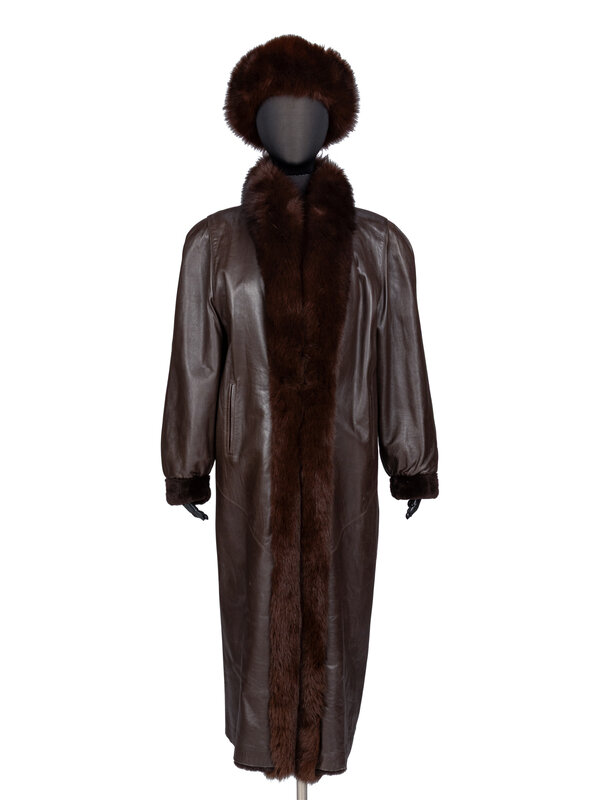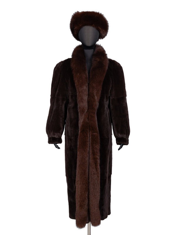 Seven-eighths-length reversible coat in sheared brown mink fur, trimmed with brown fox fur; with a reverse of brown leather. Shawl collar. Full-length sleeves with fur cuffs. Two vertical slit pockets at exterior and interior. Three hook-and-eye closures at front.