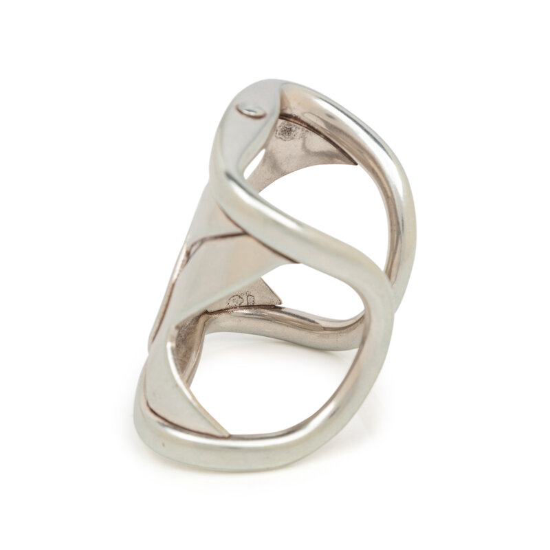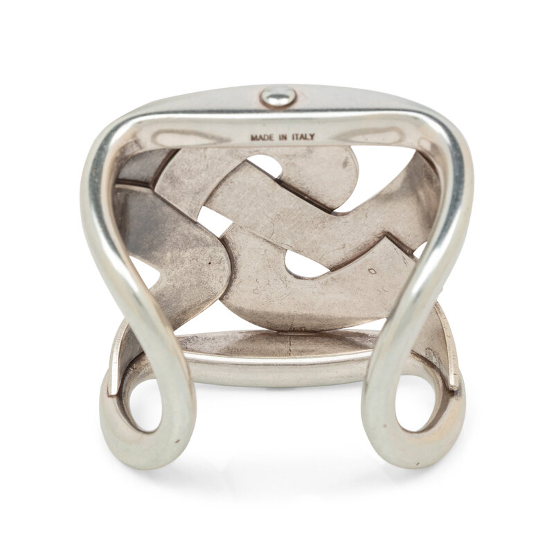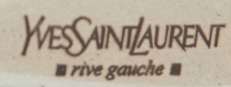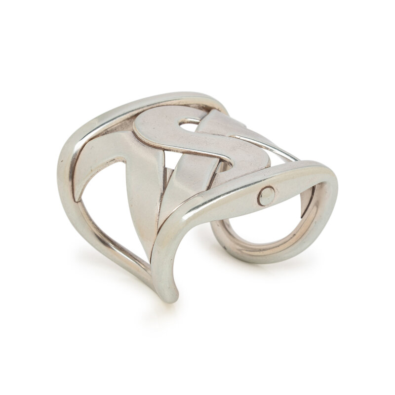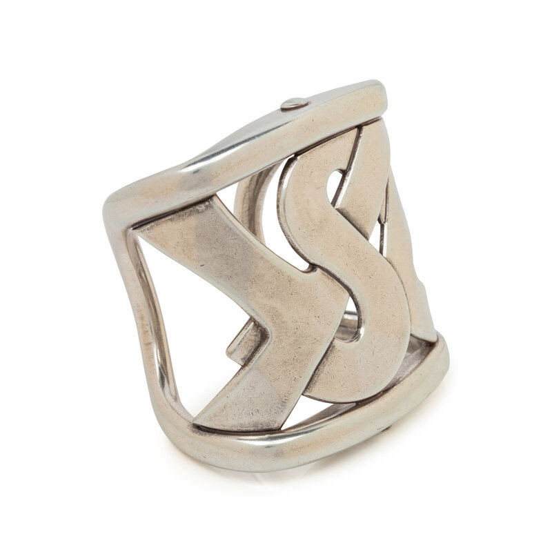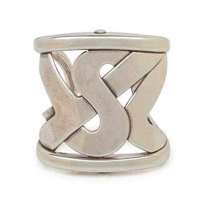 "YSL" initials cuff bracelet in silver-tone metal. Includes box.