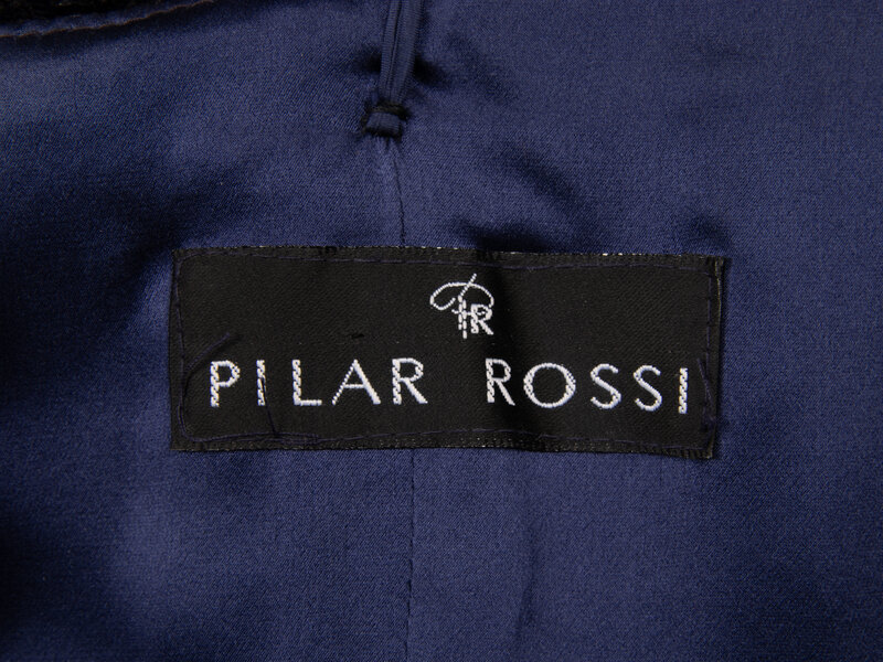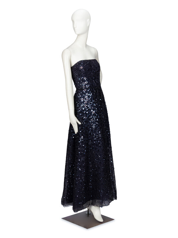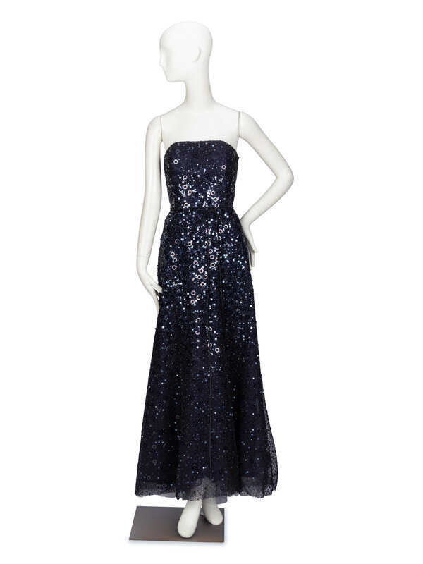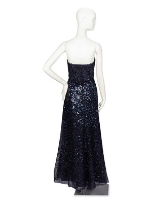 Strapless evening gown in deep navy blue satin with a sequin-embroidered net overlay. Square neckline. Fitted bodice with boning throughout. Full-length skirt with slightly flared silhouette. Black satin corded ribbon belt at waist. Invisible zipper closure at back bodice. Fully lined.