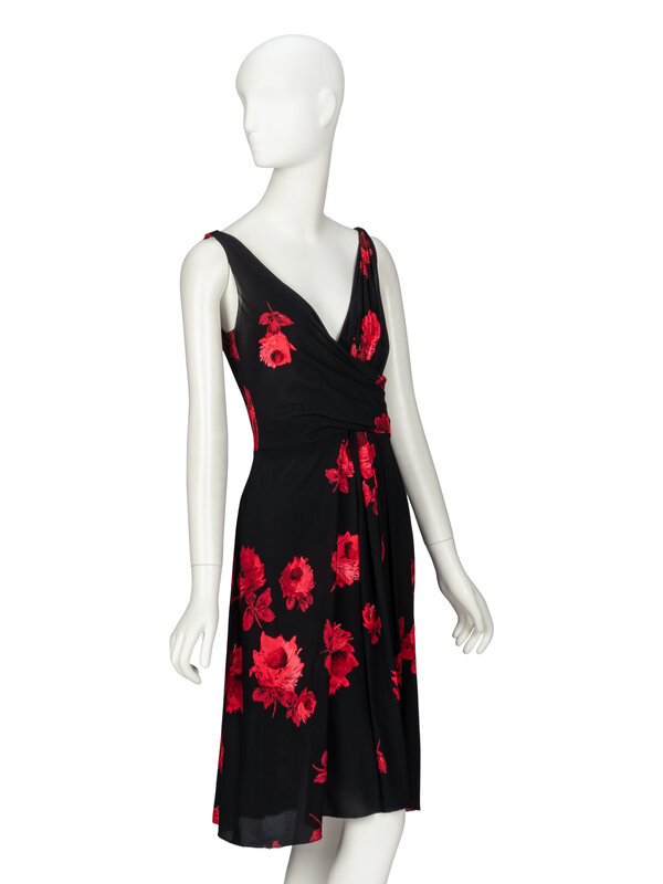 Sleeveless cocktail dress in red & black floral-print stretch-blend silk georgette. V neckline with faux-wrap draped bodice. Midi-length A-line skirt with pleats at front. Invisible zipper closure at back. Unlined.