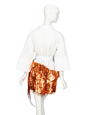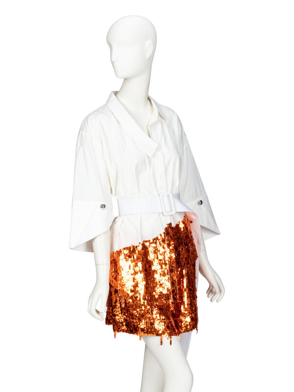 Asymmetric button-up shirt in white cotton-blend poplin with metallic orange sequin embellishments at hem. Asymmetric collar & button placket at front. Patch pocket at chest. Three-quarter length wide sleeves with pulled up cuffs with a silver-tone metal bauble. Concealed button closures at front. Thread belt loops at waist with removable white belt.