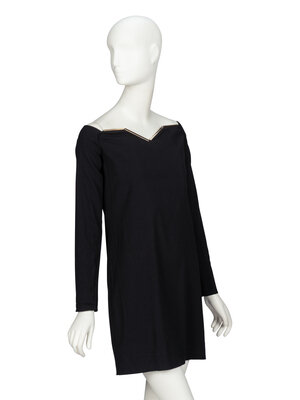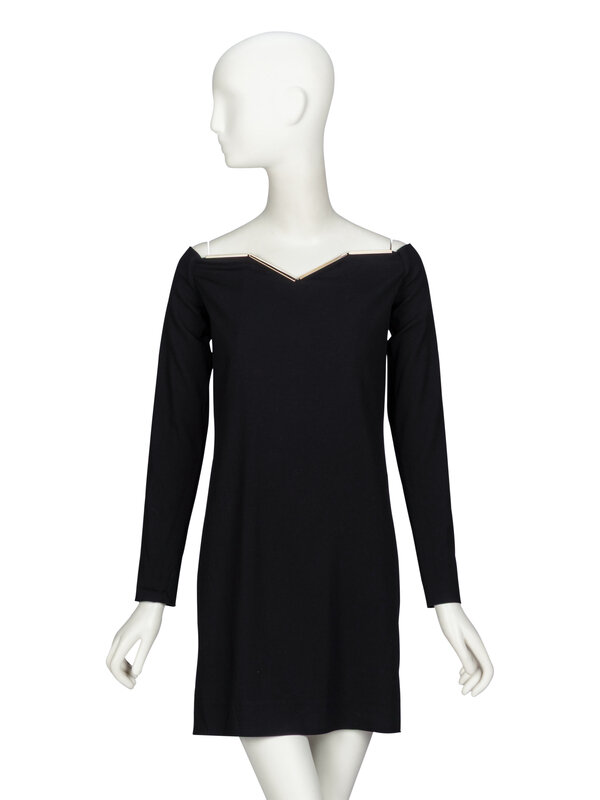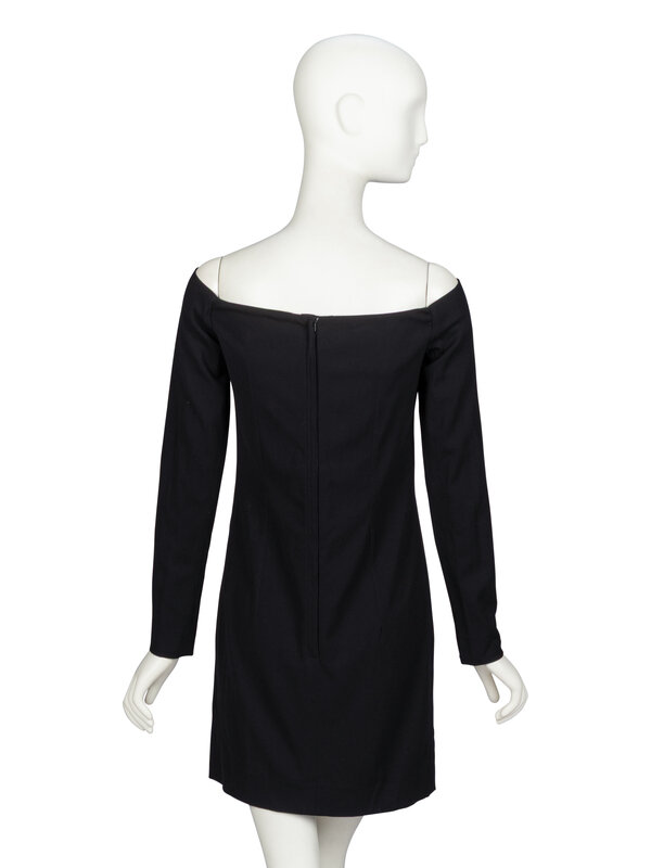 Off-the-shoulder sheath dress in stretch-blend viscose/wool-blend crêpe. Squared sweetheart neckline with gold-tone metal hardware embellishments. Interior boned corselette with petersham waistband and interior zipper closure. Full-length fitted sleeves. Straight fit bodice with an above-knee-length straight skirt. Invisible zipper closure at back bodice. Fully lined.