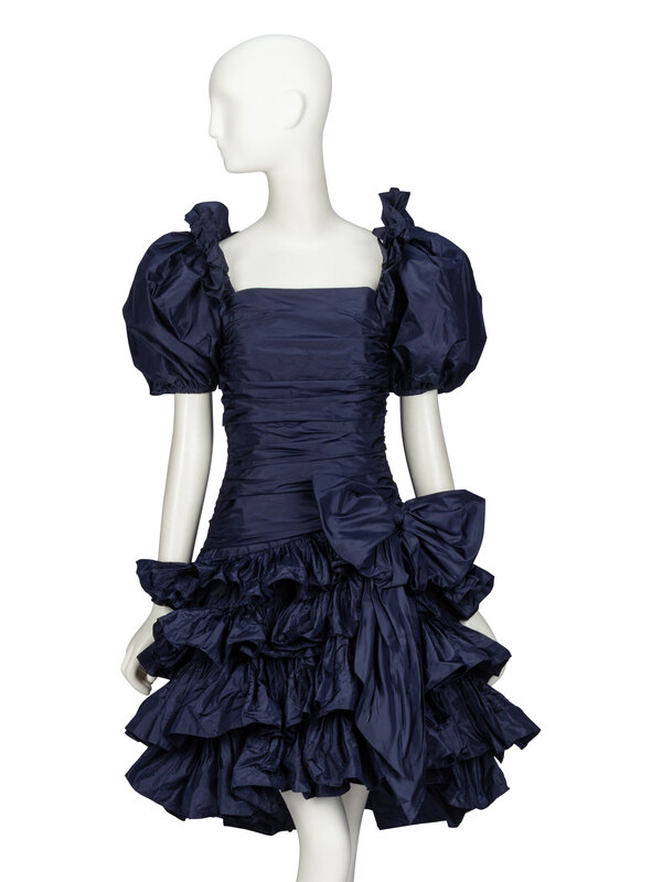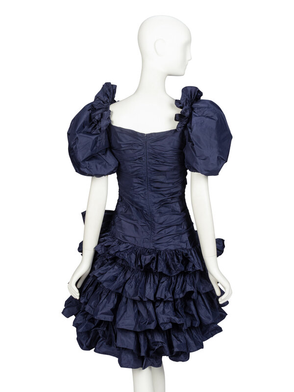 Cocktail dress in navy silk taffeta. Squared neckline; elbow-length puff sleeves with elasticated hems and ruffle trims at top. Fitted, Ruched bodice with a drop waist and large tied bow at hip. Knee-length tiered ruffle skirt. Invisible zipper closure at back. Fully lined.