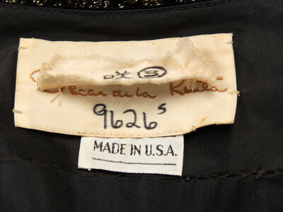 Cocktail minidress in black silk velvet with metallic bead, sequin, and rhinestone embellishments. Wide bateau neckline. Wrist-length sleeves with puffed sleeve heads and zipper closures at sleeve hems. Drop waist silhouette with a metallic gold lace tiered ruffle skirt. Invisible zipper & snap/hook-and-eye closures at left shoulder & side of back bodice. Fully lined.