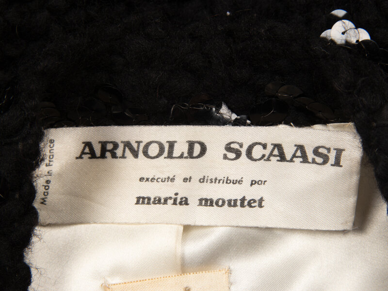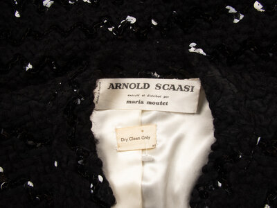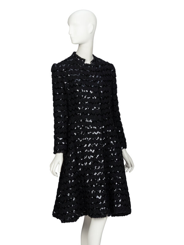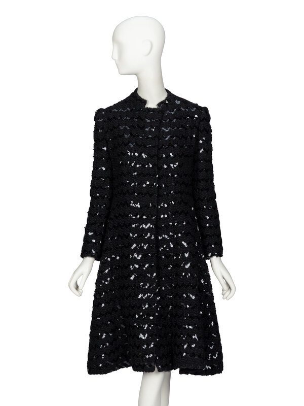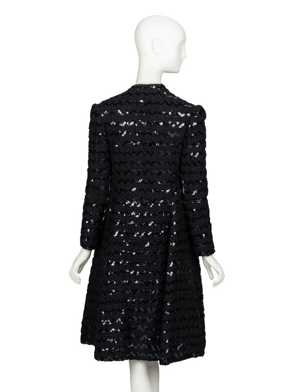 Knee-length coat in textured black wool tweed with zig-zag black sequin embellishments throughout. Fit-and-flare silhouette. Short stand collar. Full-length set-in slim cut sleeves. Two in-seam slit pockets. Fabric-covered snap closures at front. Fully lined.