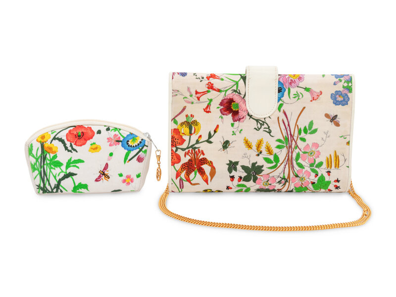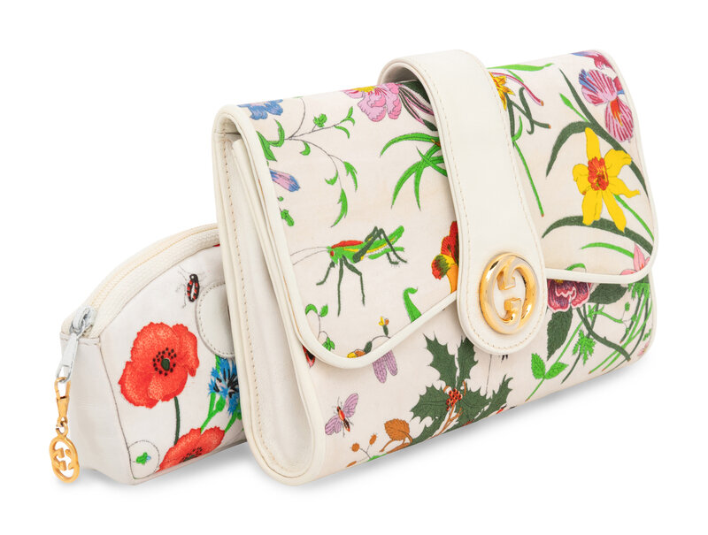 Mini pouch white Flora print fabric with white leather trim & zipper closure.