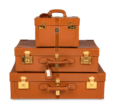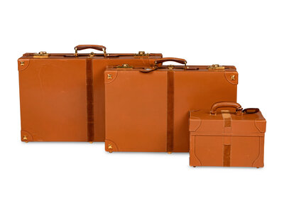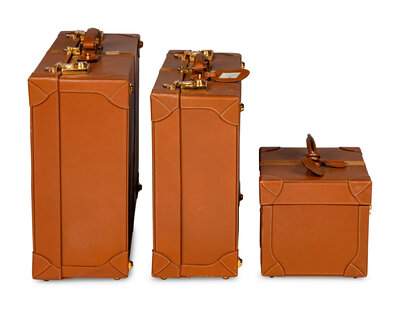 Hard sided travel box in brown pigskin leather with brown suede trim. Two locking push-lock latch closures and leather top handle.
