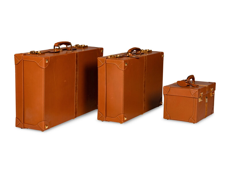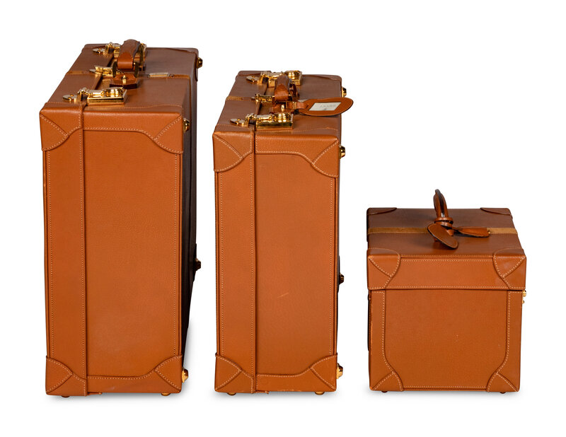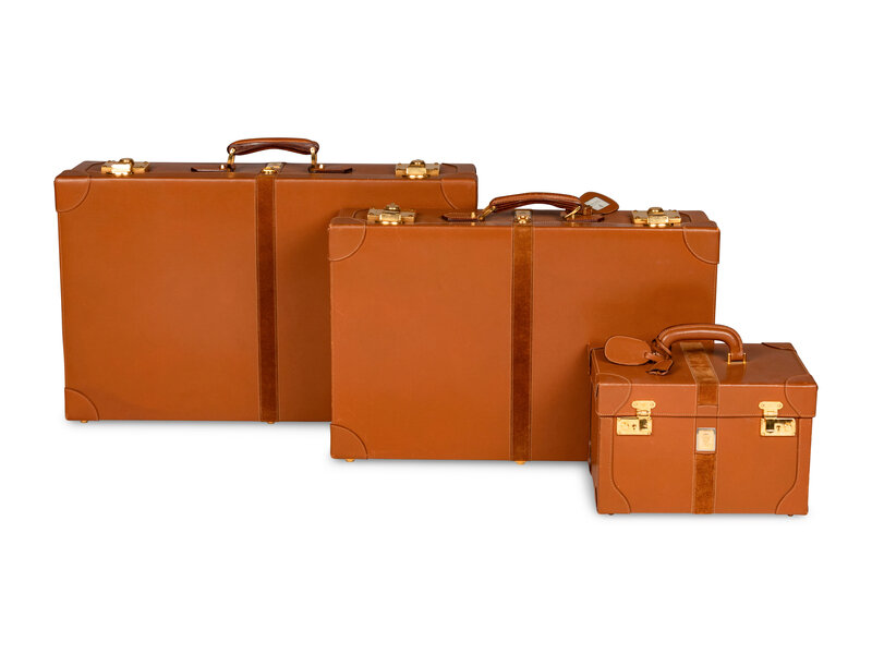 Details: Gold-tone hardware, two locking push-lock latch closures, green leather lining, removable mirror at interior lid, two adjustable leather straps at interior for bottles, metal protective feet at base.