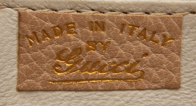 Details: Gold-tone and silver-tone hardware, threaded closure to flap, grey leather lining, three interior compartments, three interior slip pockets, one interior zipper pocket