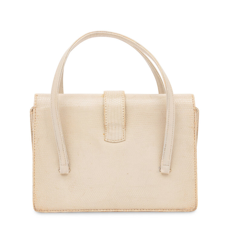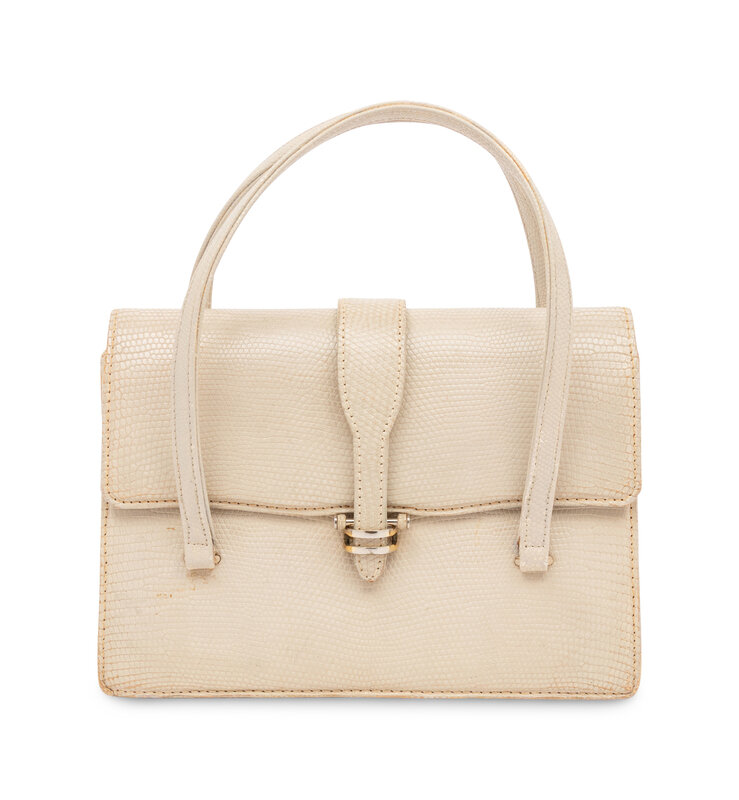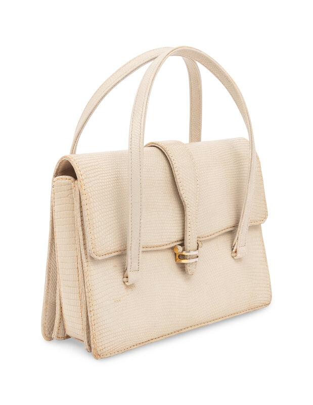 Handbag in stone grey lizard skin. Threaded closure and flat lizard skin handles.