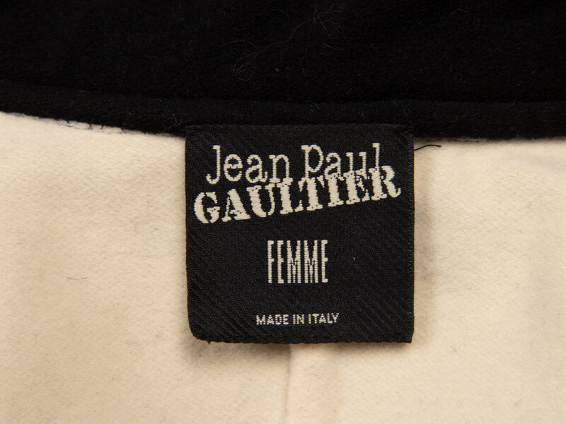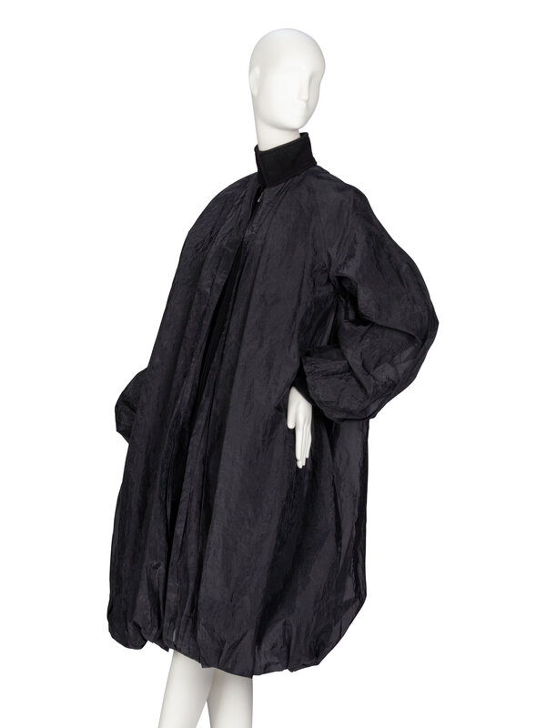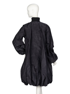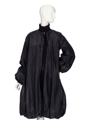 Three-quarter length coat in black wool with a black shimmery polyester 'bubble' outer layer. Stand collar with snap closures. Full-length bishop sleeves with snap closures at cuffs. Two pockets at front. Double-ended zipper closure at front. Fully lined.