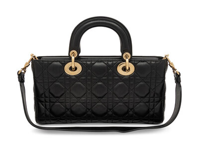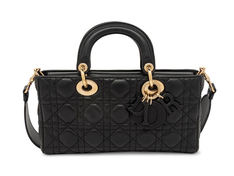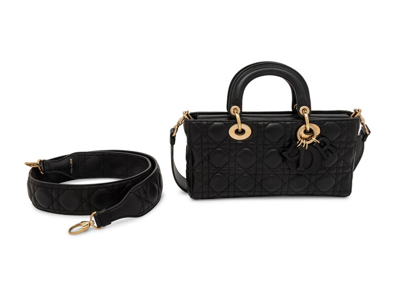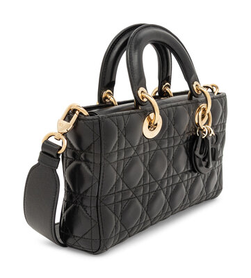 Lady D-Joy bag in Cannage-quilted black lambskin leather. Magnetic snap closures to top flap; rolled leather handles, removable flat leather shoulder strap, and removable quilted leather crossbody strap.