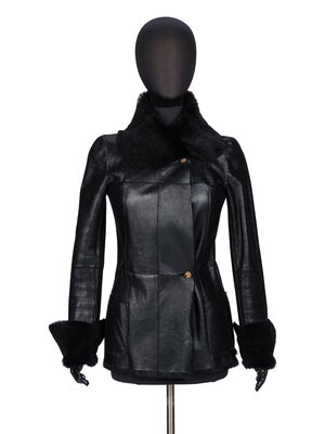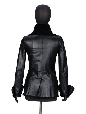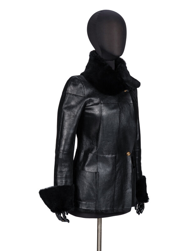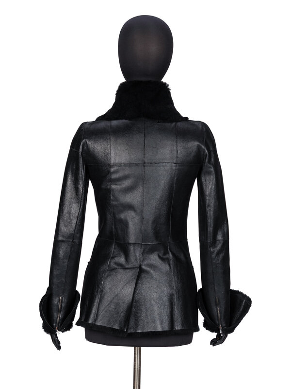 Fitted jacket in shiny black leather with a black rabbit fur reverse/interior. Rounded convertible spread collar. Full-length sleeves with optional turn-up cuffs and zipper closures at sleeve hems. Two patch pockets at front. Two button closures at front. Fully fur-lined.