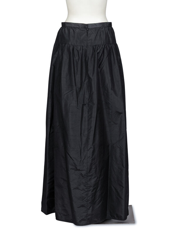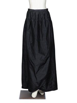 Faux-wrap maxi skirt in black silk shantung. Gathers at hips with layered wrap front. Zipper and hook-and-eye closures at back waist. Fully lined.